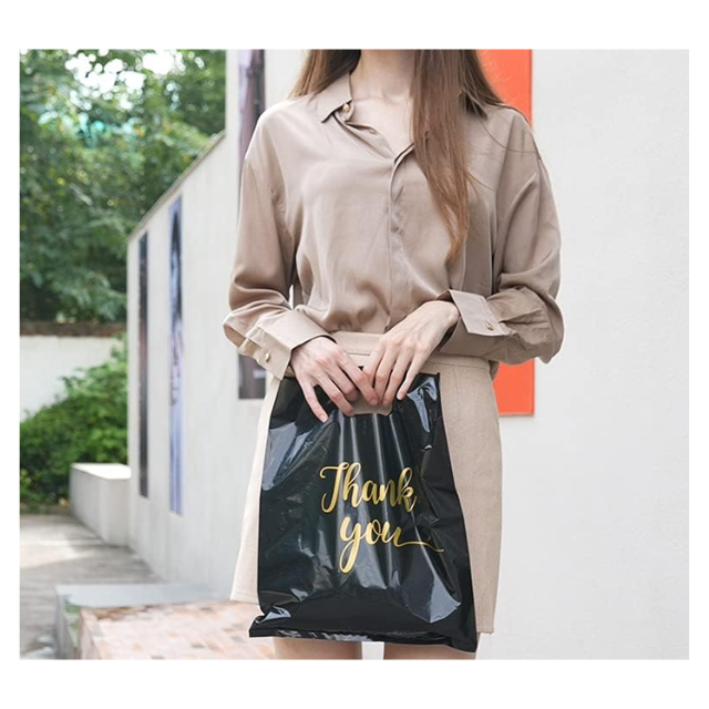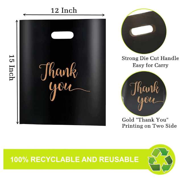 Sturdy black thank you plastic bags great for holding various items as party bags, gift bags, shopping bags, retailer bags, merchandise bags, packaging bags for small business